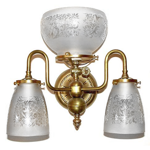 This is a gas light reproduction shown with French acid etched glass. The straight part of the arms coming out of the center body can be elongated, offering a wider overall width if needed. Many other custom options are available.
