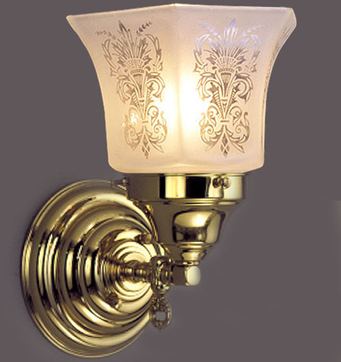 An excellent light for hallways bedrooms or flanking your dining room table. Pictured with this frosted hexagonal acid etched glass shade and gorgeous beehive canopy. Beautiful detail down to the realistic gas key.