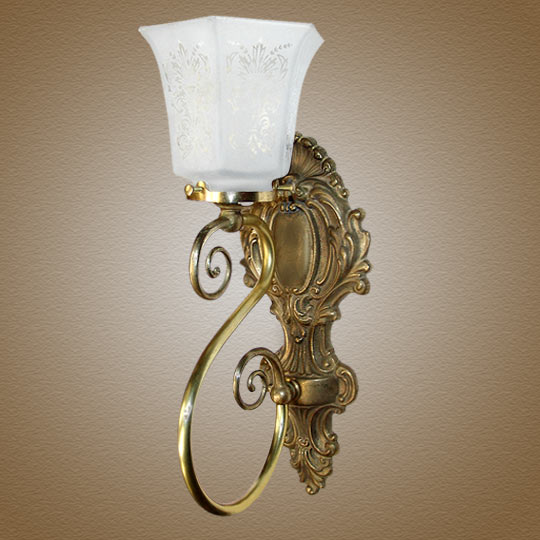 Continuing with the swooping 'S' arm, this Victorian gas wall light reproduction also features an acid etched hexagonal glass and uses the cast embellishments perfectly. A lovely contrast against the smooth brass tubing. Perfect in pairs anywhere you feel comfortable placing it. As with most of our sconces, many custom options are available including a multi arm design and alternate metal color and glass.